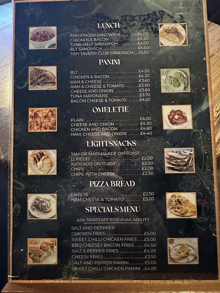 The café also excels in delicious snacks like their Cheese Pizza Bread (£2.50) and hearty main dishes, including an all-day breakfast that patrons rave about. Customer reviews highlight the full English breakfast as nothing short of fantastic, while sandwiches and paninis receive equal praise for their quality and flavor. With friendly staff and a cozy vibe, Tiny Tavern is a must-visit destination for a satisfying meal any time of day.